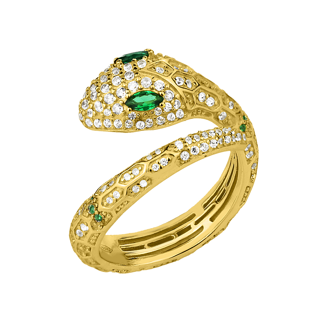 Solid gold plated silver snake ring 925º, decorated with white and green zircons.