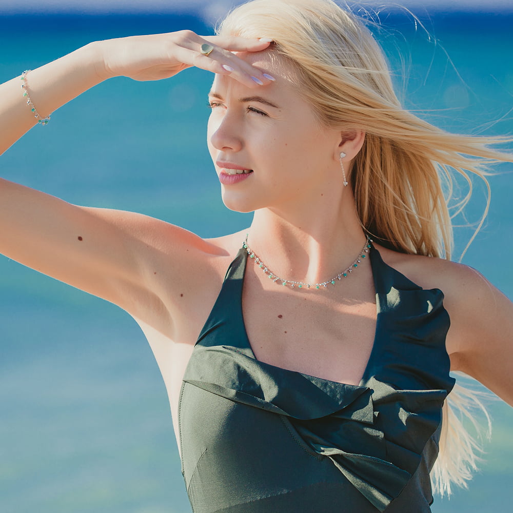 Handmade necklace with silver chain 925° decorated with turquoise and silver chains beads.