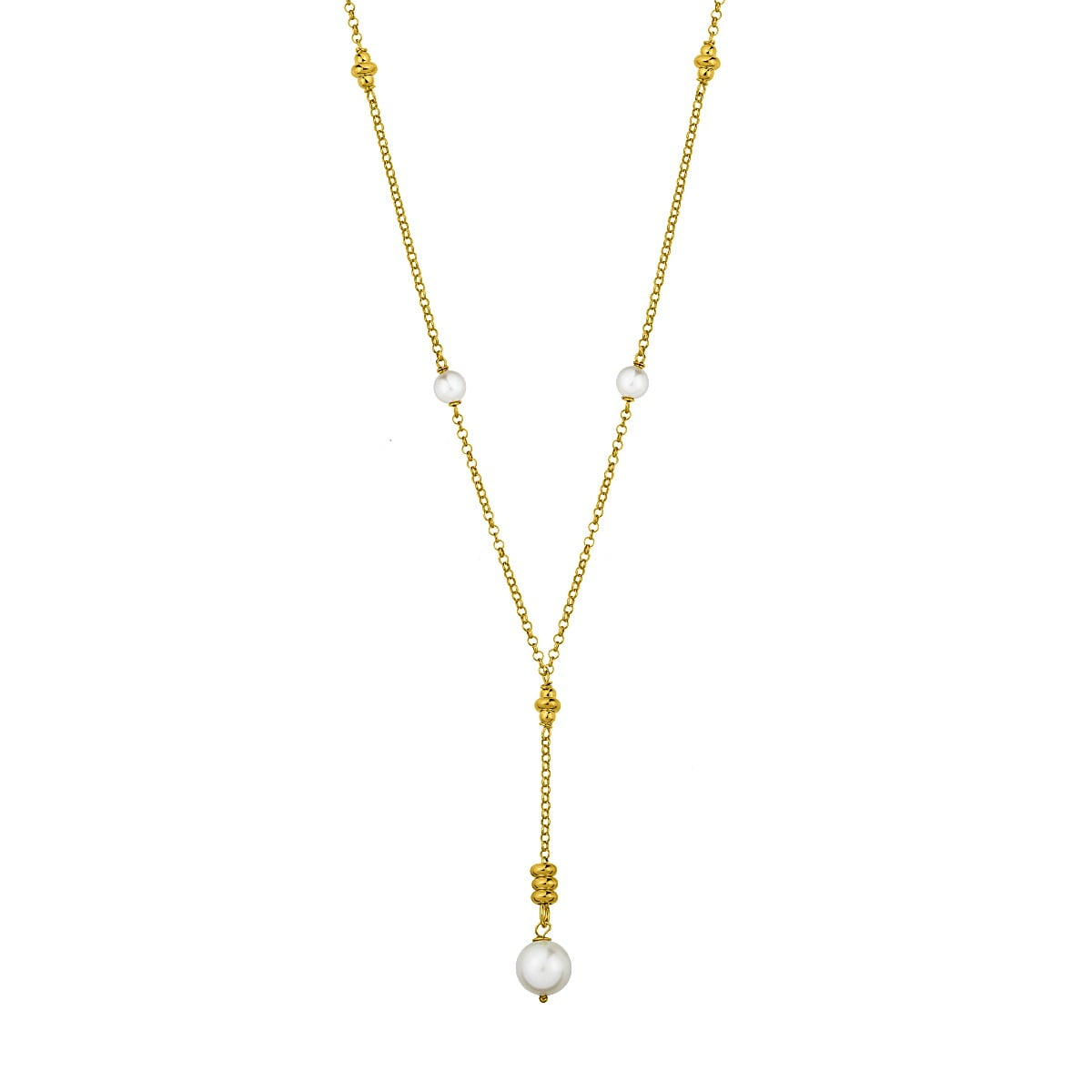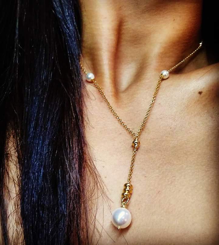 Chain necklace made of gold plated silver 925°, decorated with synthetic pearls and silver grommets.