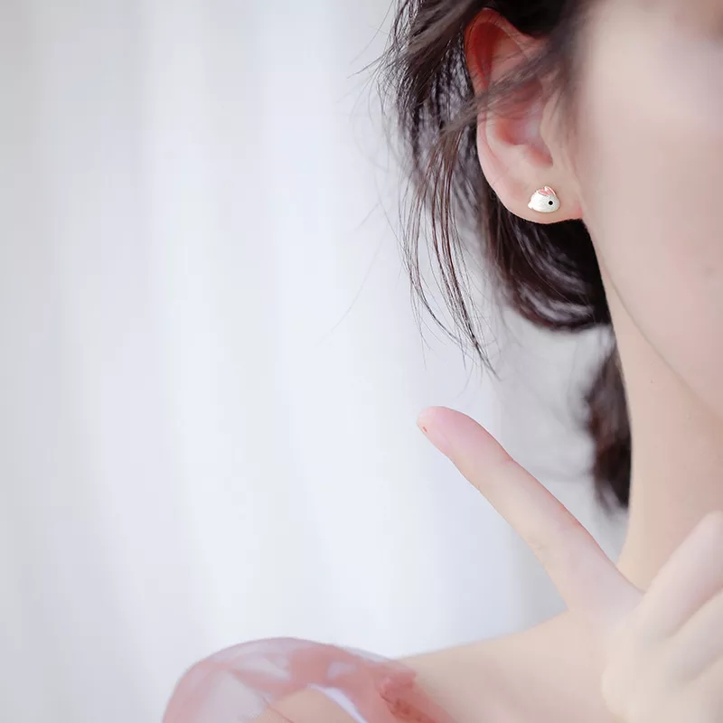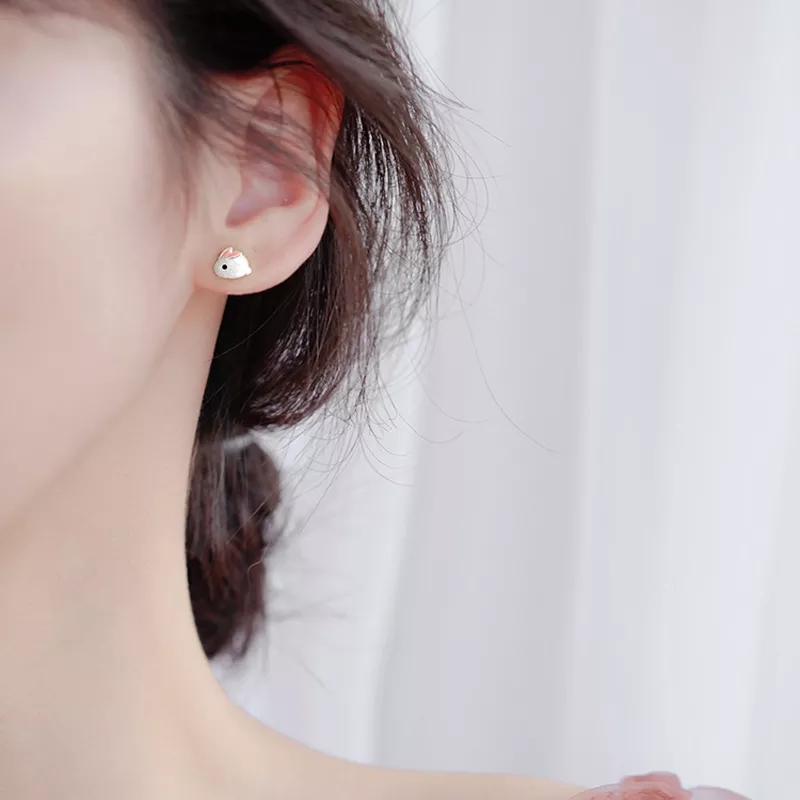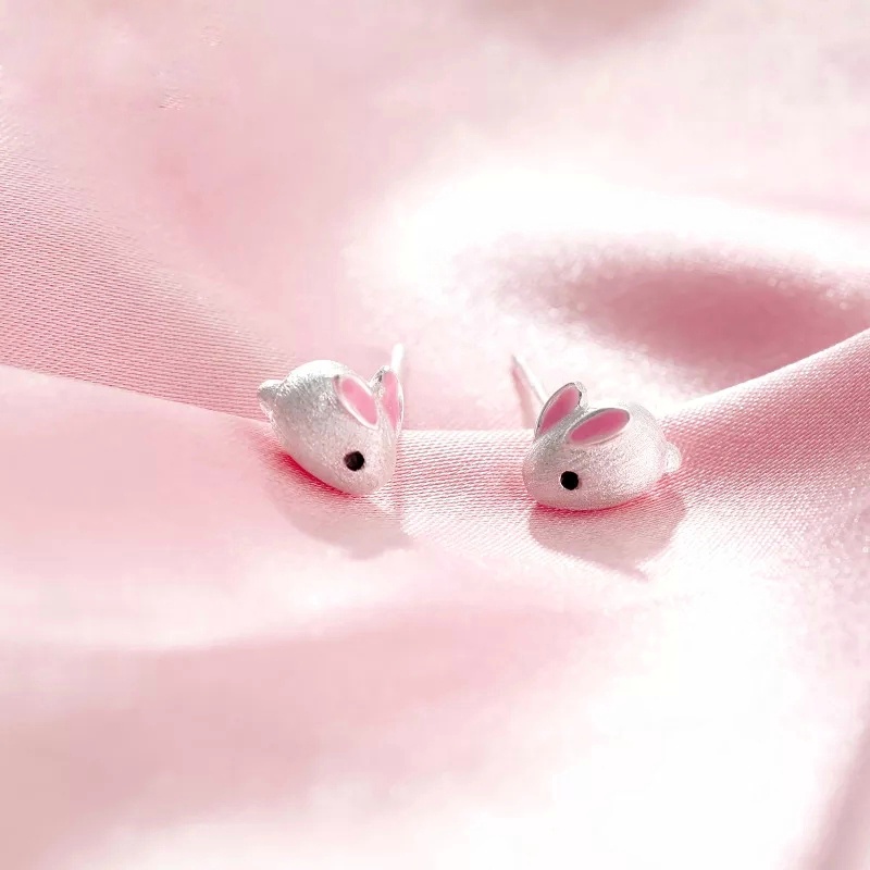 Earrings of silver 925° bunnies, decorated with pink enamel and pin clasp.