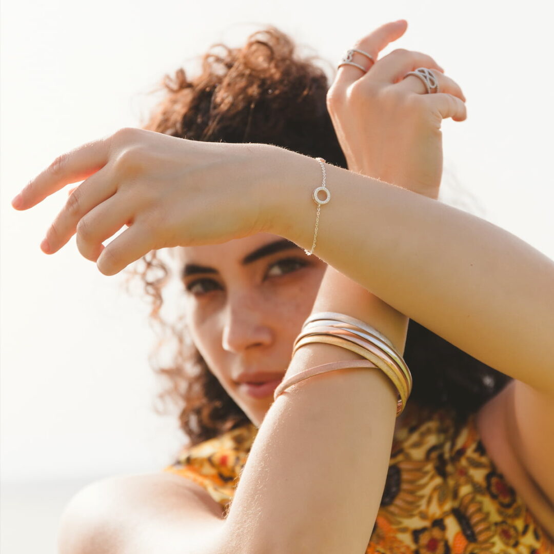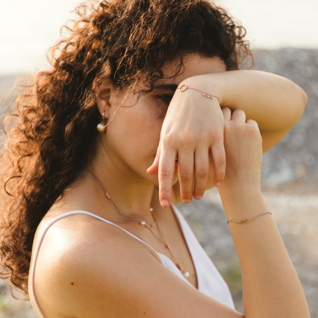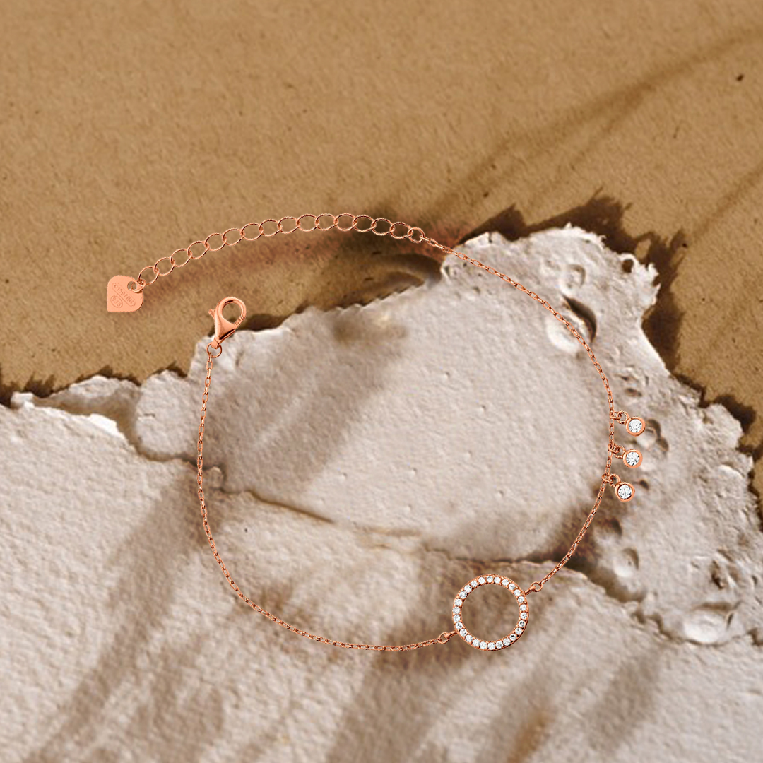 Βραχιόλι από ροζ επιχρυσωμένο ασήμι 925° με κύκλο διακοσμημένο με λευκά ζιρκόνια, και διακοσμητικά τρία μονόπετρα.