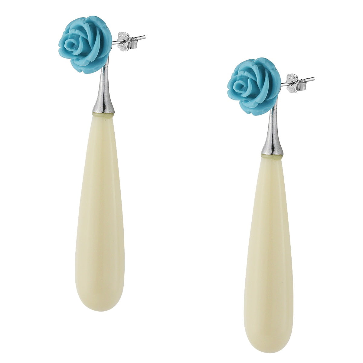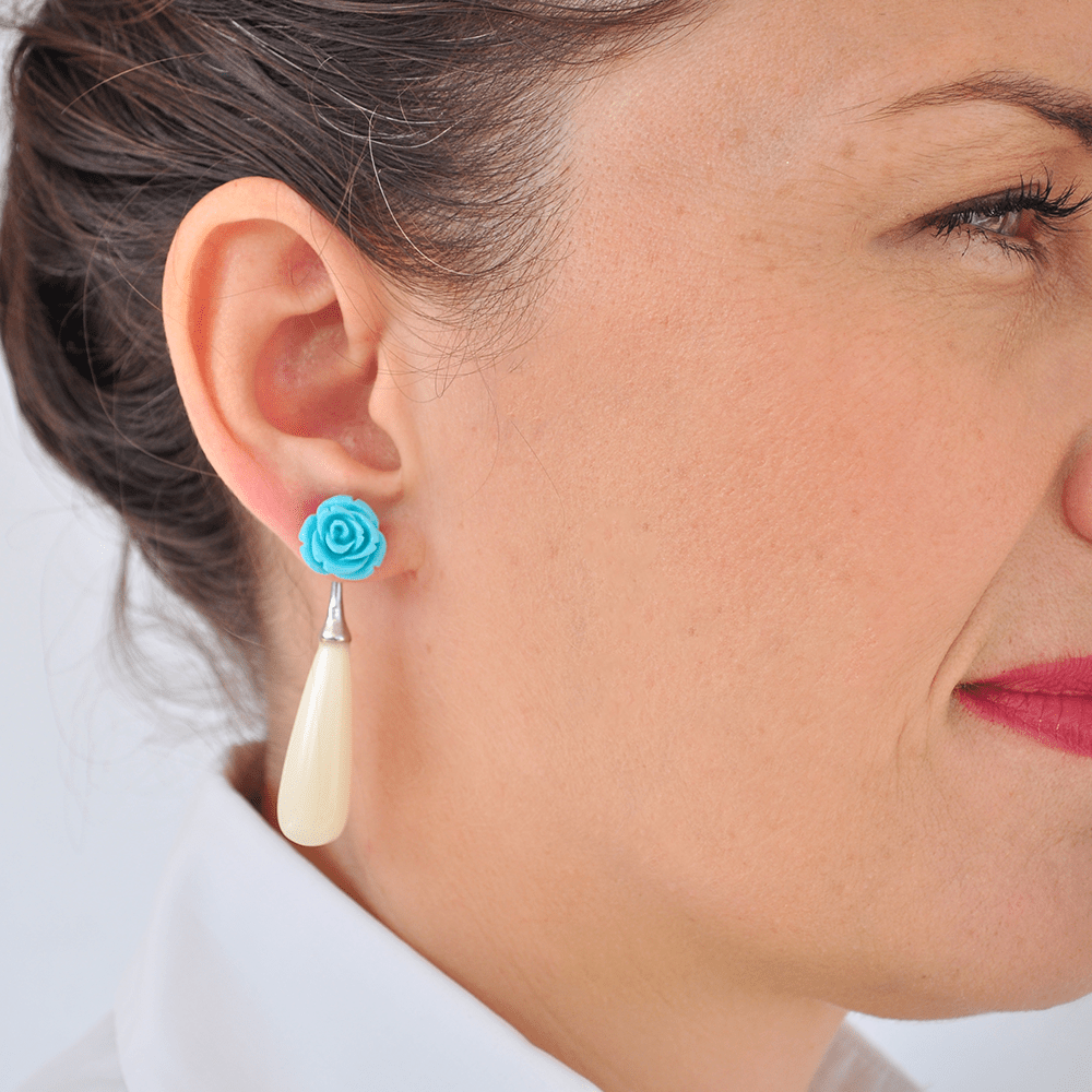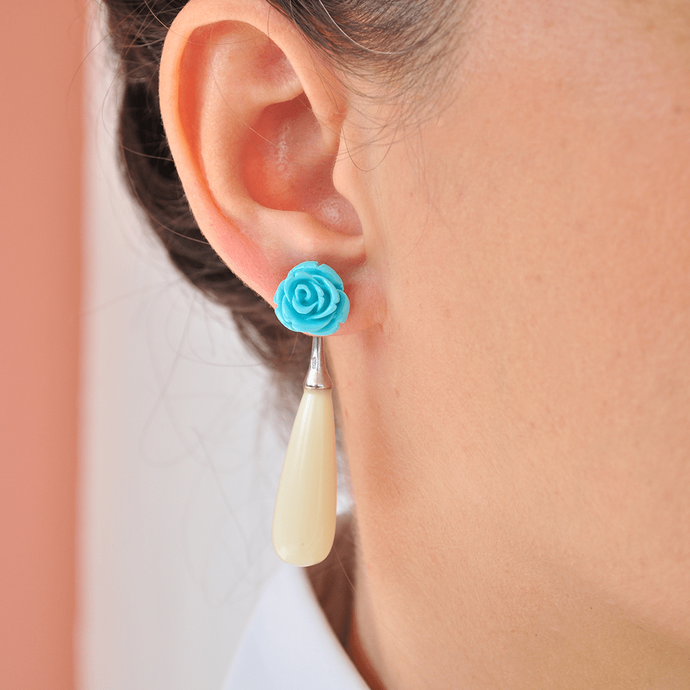 Σκουλαρίκια διπλά με στοιχεία από ασήμι 925°, με δάκρυ από λευκή πάστα και τριαντάφυλλο από τυρκουάζ, τα οποία φοριούνται και ανεξάρτητα.
