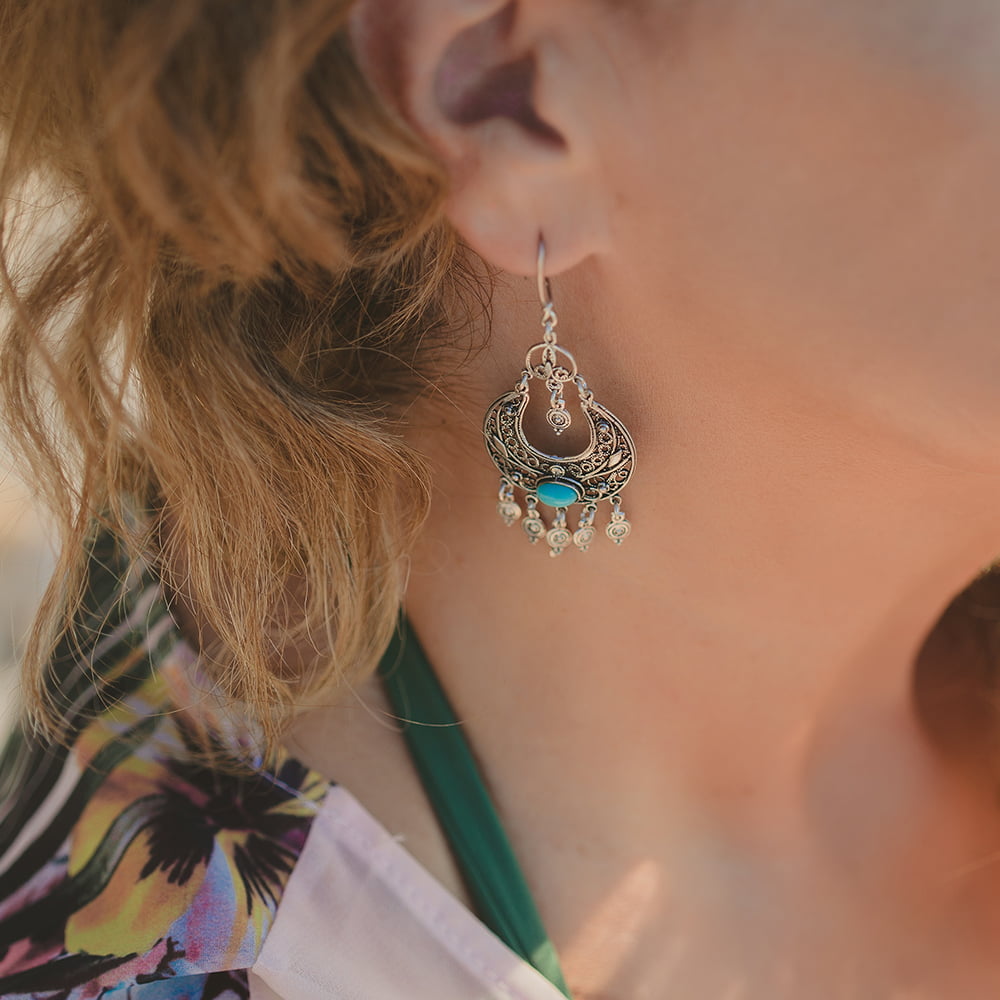 Boho κρεμαστά χειροποίητα σκουλαρίκια με την τεχνική φιλιγκράν, διακοσμημένα με πέτρα τυρκουάζ, από ασήμι 925° σε ανοιχτό γάντζο.